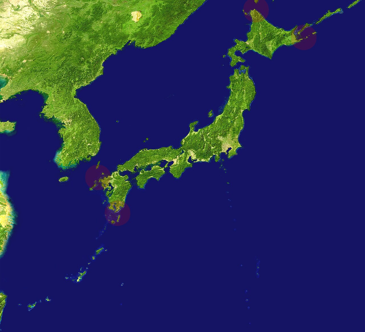 - Sud : Cap Sata, Kagoshima (30° 59′ 39″ N, 130° 39′ 38″ E)